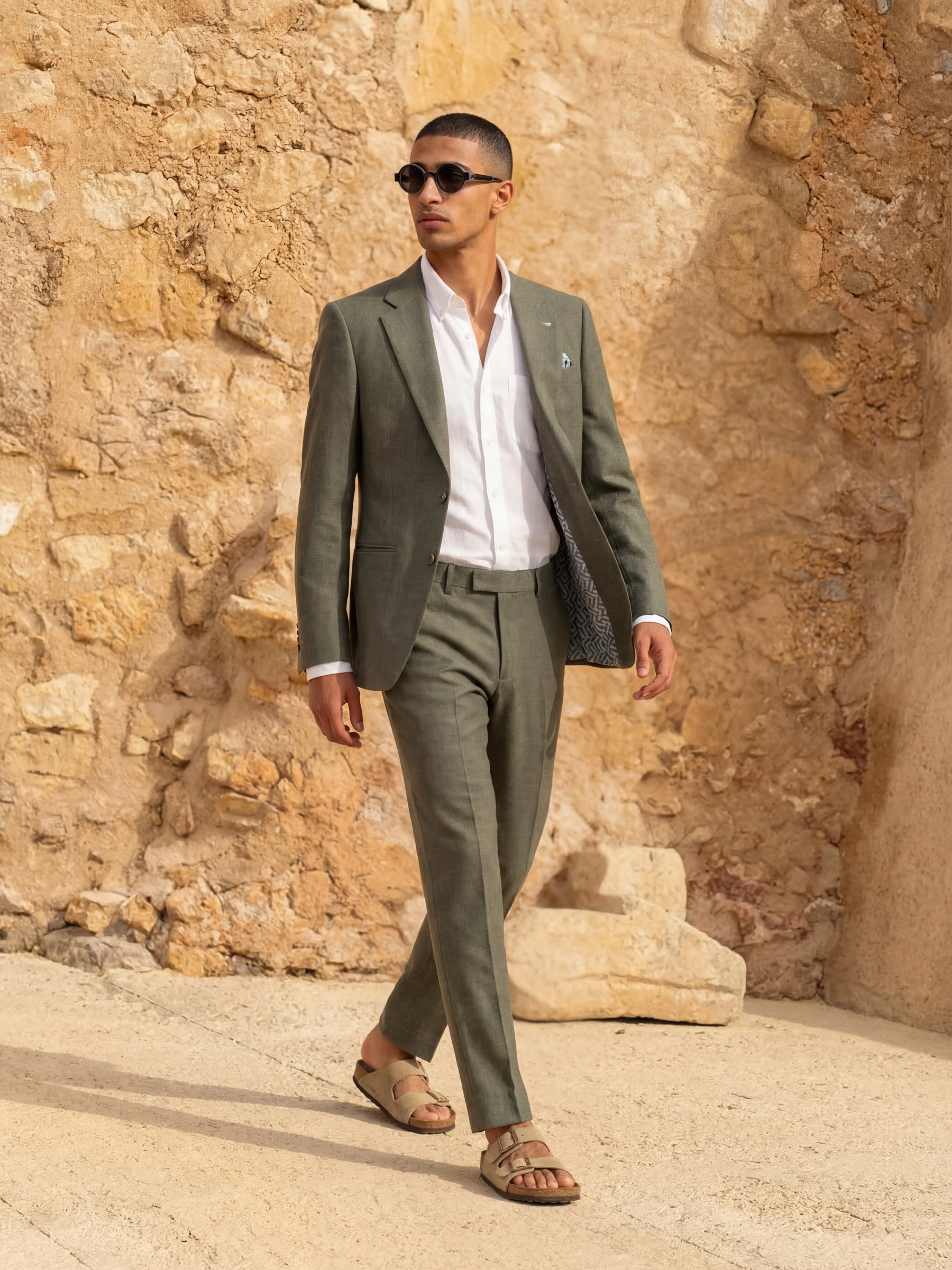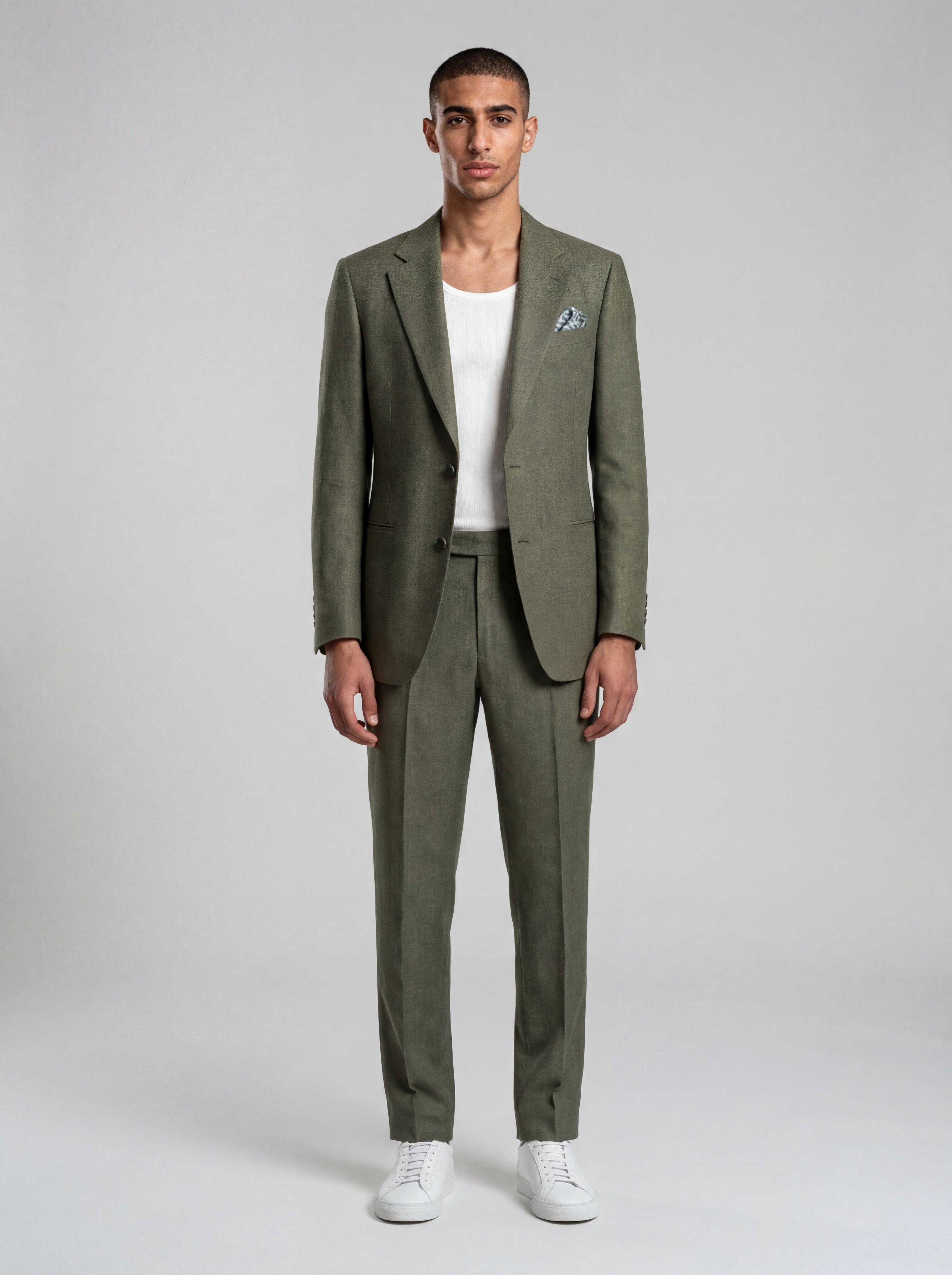 Cut with Harry Brown London’s signature clean lines, this dark green suit is a strong pick when warm-weather invites start rolling in. Crafted from a cooling cotton–linen blend, it has that easy, airy feel for sunnier days, while the slim-fit silhouette keeps the look sharp and modern.