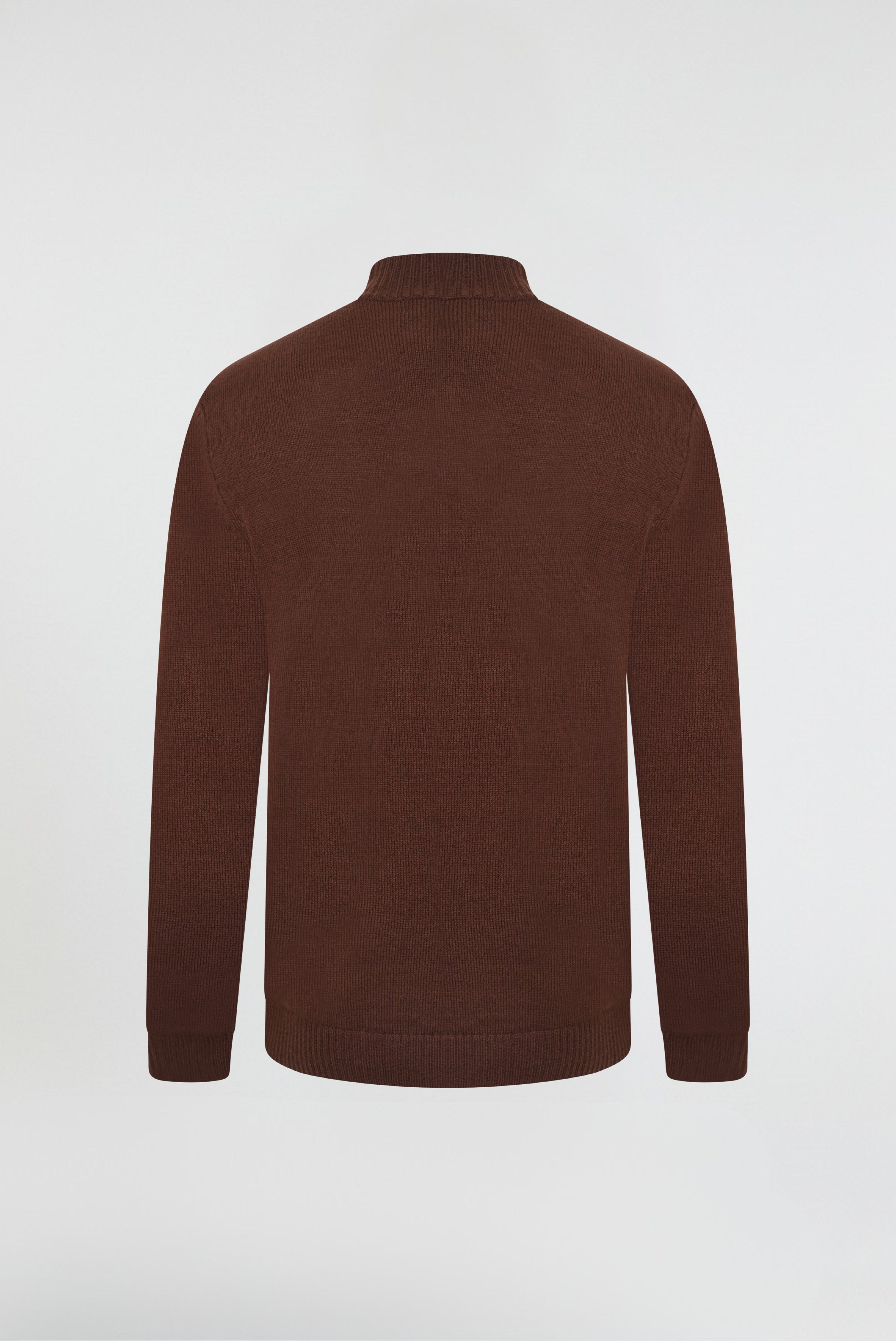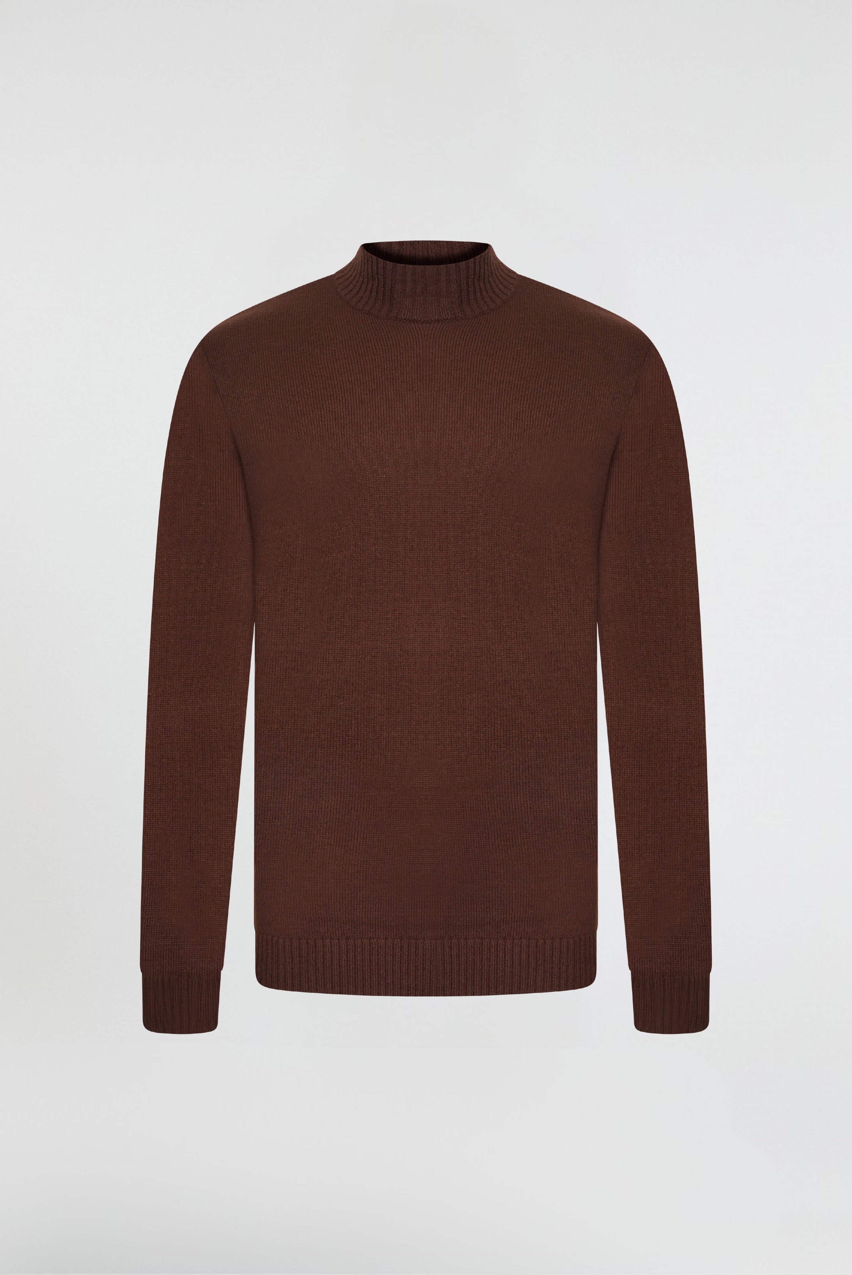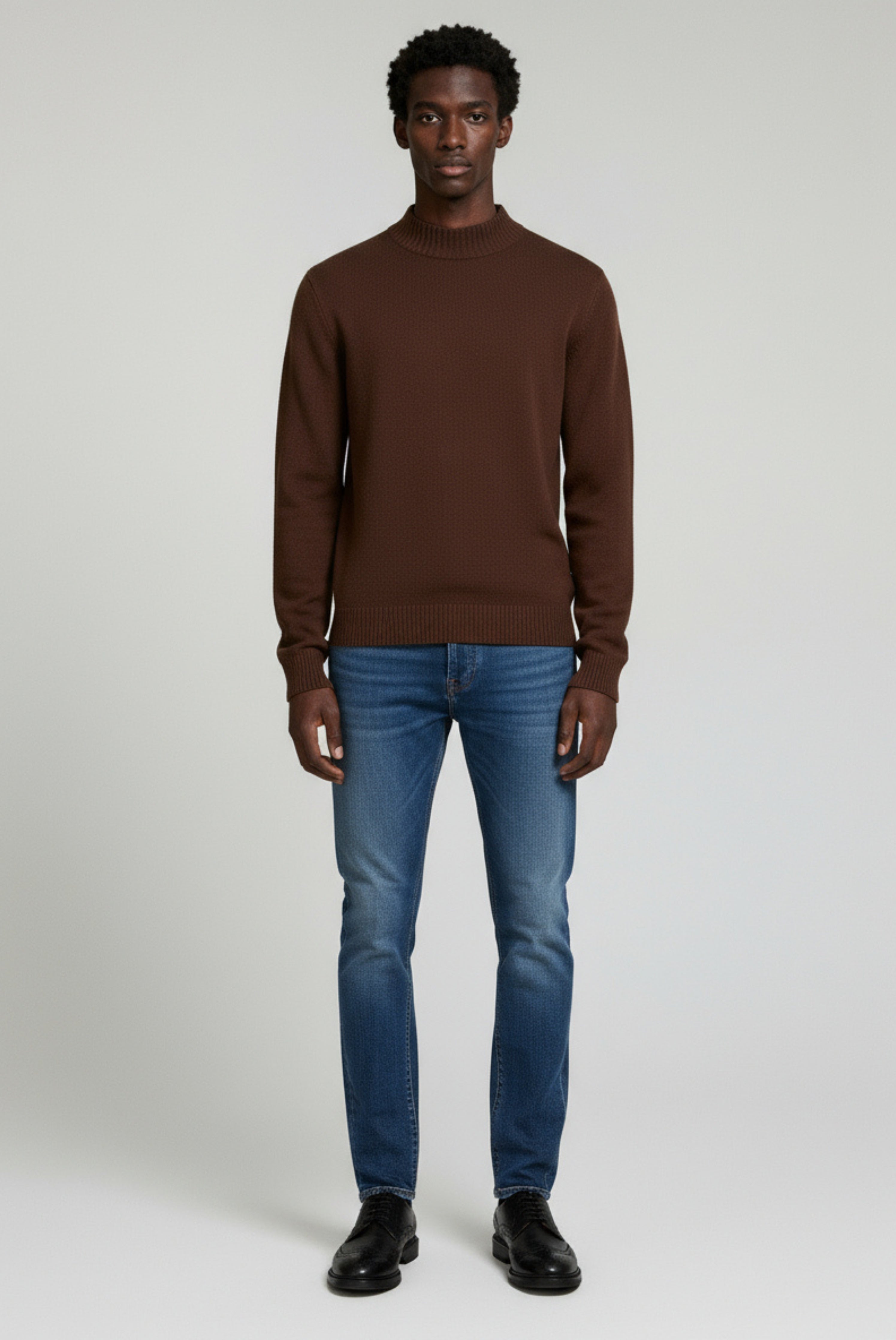 Add some warmth to your everyday line-up with this casual mock neck jumper in a rich chocolate shade. Cut in the same easy slim fit as our black/white version, it sits cleanly on the body and layers effortlessly over tees or under coats. The subtle textured knit and mock neck give it a modern, put-together feel that works just as well with denim as with tailored trousers.